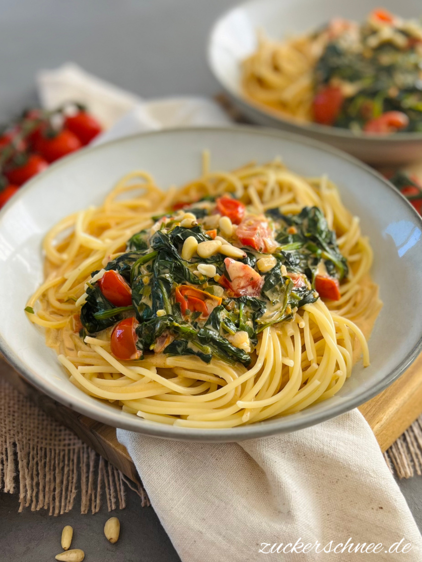 • Wenn du magst, kannst du deine Spinat Pasta noch zusätzlich mit gerösteten Pinienkernen toppen. Ich lieb´s 🙂